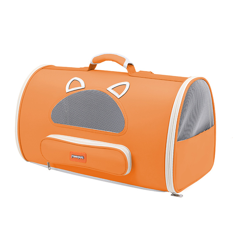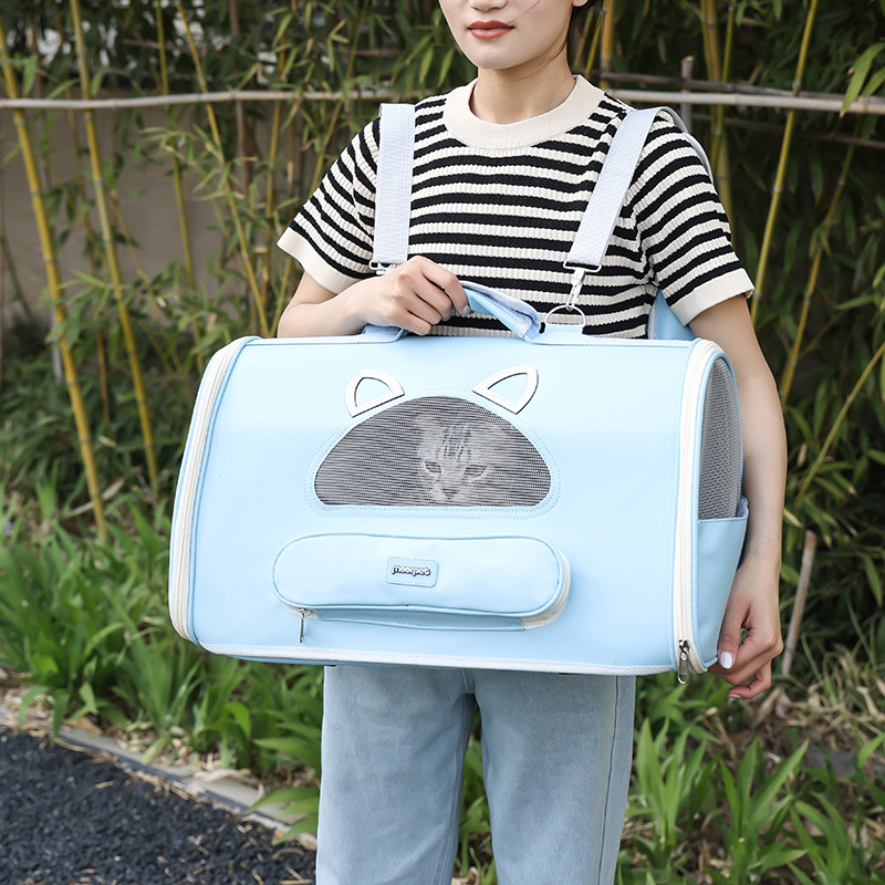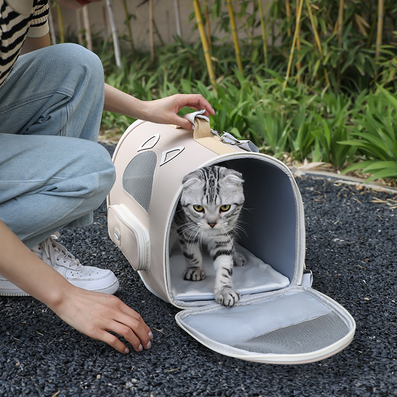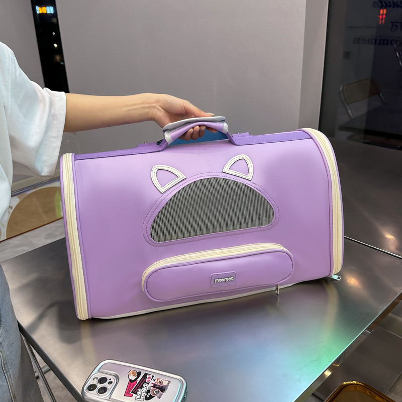 可愛らしい猫耳デザインが特徴的なペット キャリーです。 前面と側面にメッシュ窓を配置し通気性を確保しながら猫の様子を常に確認できます。 底面は開閉式で出入りがスムーズに行え、内部は柔らかい素材で快適な空間を実現しました。 肩掛けベルト付きで持ち運びも楽々、動物病院への通院やお出かけに最適です。 コンパクトに折りたためて収納にも便利な実用的なキャリーバッグです。